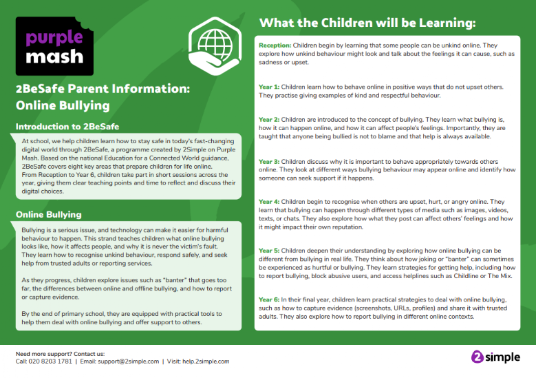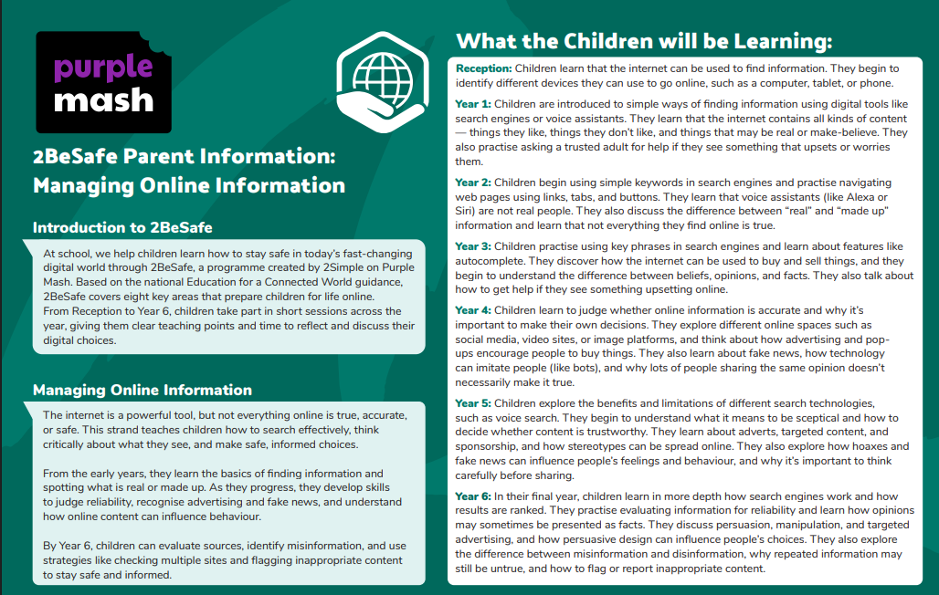 Online safety is a key part of our curriculum for both Computing and Personal, Social and Health Education. Online Safety is taught through progressive units across school using Purple Mash, which teach safe, responsible and respectful behaviour when online (please see Computing tab for more information). In PSHE, it is covered throughout the units where appropriate. This is a safe forum where the children can ask advice and voice any issues or concerns. If there are any issues that arise, these are dealt with quickly and we seek professional advice where needed so that we are giving the correct messages to our young people. This year, we are also introducing additional sessions throughout the year using 2BeSafe and Project Evolve, which are both linked to the document 'Education for a Connected World'.